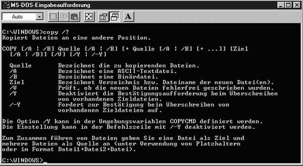 Dieses Buch kann sich keiner grundlegenden Beschreibung von MS-DOS-Befehlen und ihren Parametern widmen. Es gibt ganze Bücher zu diesem Thema. Wenn es Sie interessiert, lesen Sie im Hilfe-System nach oder kaufen Sie sich ein entsprechendes Nachschlagewerk, etwa