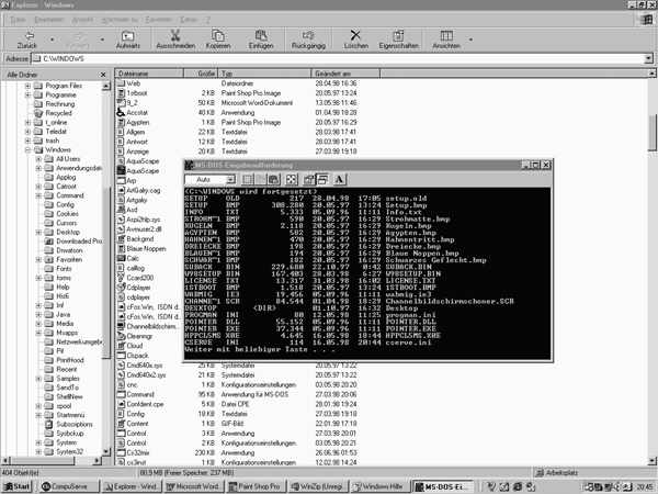 Auch in der Windows-98-Umgebung gibt es MS-DOS. Es gibt drei Wege, die in das MS-DOS führen: Sie können vom Boot-Menü aus hingelangen, Sie können eine MS-DOS-Sitzung starten (das heißt, Sie führen das Programm COMMAND.COM aus), oder Sie können Windows 98 in den MS-DOS-Modus herunterfahren, nämlich über Start | Beenden.