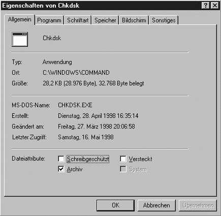 Um die Einstellungen für MS-DOS-Programme anzupassen, die bei der Ausführung unter Windows 98 Probleme machen, suchen Sie die Programmdatei, klicken mit der rechten Maustaste darauf und wählen im Kontextmenü den Eintrag Eigenschaften. Windows 98 ist intelligent. Es erkennt, ob es sich um ein MS-DOS-Programm handelt. Wenn das der Fall ist, zeigt es ein Eigenschaften-Dialogfeld an, in dem die Parameter für solche Programme gesetzt werden können. Wenn Sie die Intelligenz von Windows 98 testen wollen, klicken Sie mit der rechten Maustaste auf ein MS-DOS-Programm und dann auf ein Windows-Programm, um die Unterschiede im Dialogfeld zu sehen.