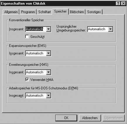 MS-DOS-Programme verwenden verschiedene Schemata, wie sie Daten oder sogar Code in Bereiche schreiben, die ihnen eigentlich nicht zur Verfügung stehen. Windows 98 kann erkennen, welchen Speichertyp ein Programm braucht, und spiegelt ihm dann vor, es hätte erhalten, was es angefordert hat. In einigen Fällen fordert ein Programm jedoch nichts an, sondern setzt voraus, daß es vorhanden ist. In solchen Fällen kann Windows 98 selbst getäuscht werden. Wenn Ihr Programm nicht richtig läuft und Sie wissen, daß es beispielsweise einen bestimmten Betrag an EMS-Speicher braucht (das erfahren Sie aus der Dokumentation), könnten Sie versuchen, den Expansionsspeicher vom Vorgabewert Automatisch auf den von Ihrem Programm benötigten Wert zu setzen. Analog könnten Sie für XMS- und DPMI-Speicher vorgehen. Einige Programme brauchen sehr viel Umgebungsspeicher. Das könnten Sie im Feld Ursprünglicher Umgebungsspeicher einstellen.