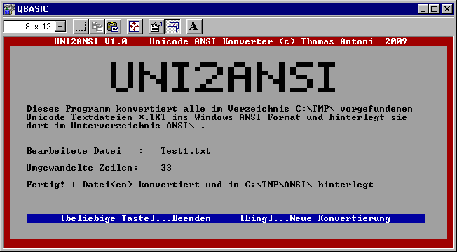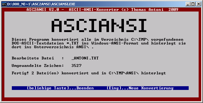 | ASCIANSI.zip (154 KB)  | Thomas Antoni | ASCII-ANSI-Konverter V2.0 NEU ! Die neue Version V2.0 (vom 10.2009) funktioniert jetzt auch unter Windows XP. Es werden "in einem Rutsch" alle ASCII-Dateien, die sich im Verzeichnis C:\TMP\ befinden ins ANSI-Fomat konvertiert!